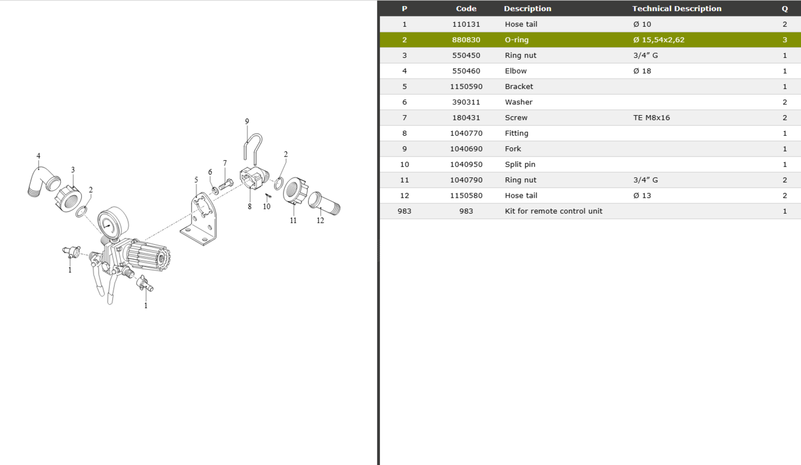 Control unit with working pressure regulating valve, by-pass control lever and glycerine bath pressure gauge with coloured dial.